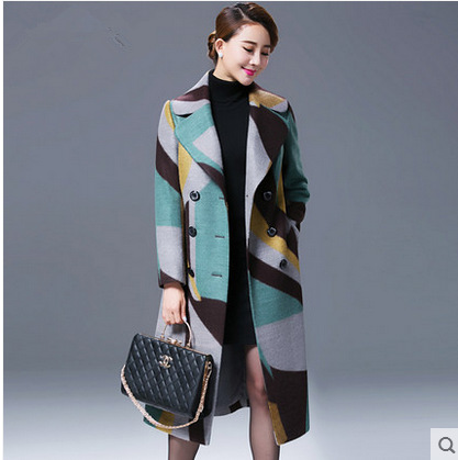 #2015新款 中長(zhǎng)款大碼雙排扣彩格呢大衣 /