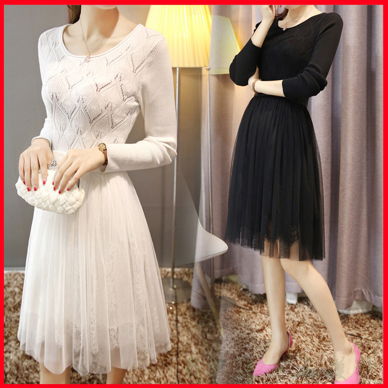 #2015秋季女裝針織長(zhǎng)袖連衣裙修身蕾絲拼接網(wǎng)紗氣質(zhì)公主裙 /