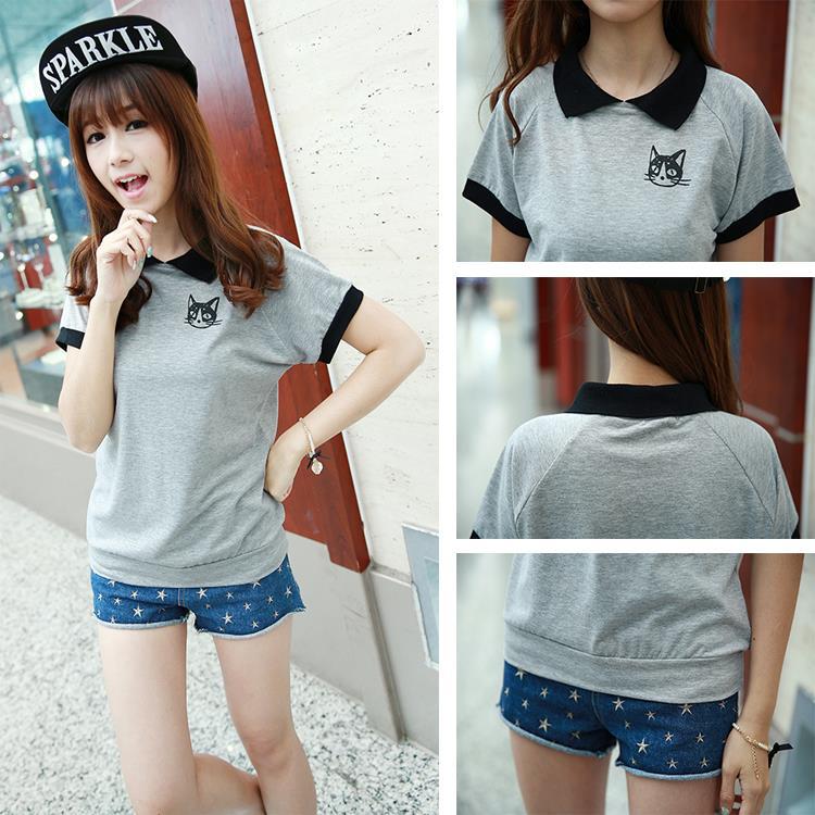 夏季新款2014韓版小貓咪氣質(zhì)修身棉翻領(lǐng)短袖T恤女上衣 /