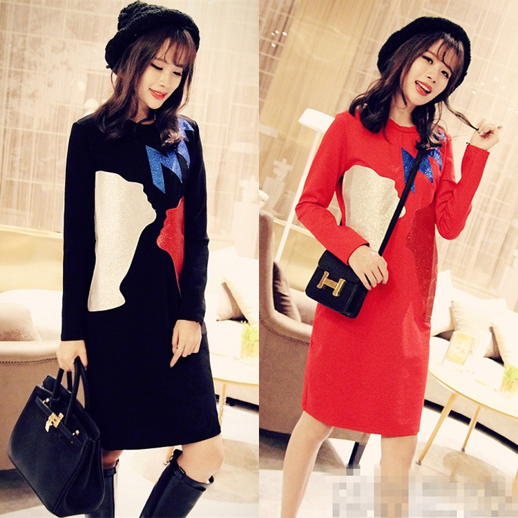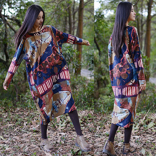 8386 2015秋寬松大碼民族風(fēng)打底裙長袖長款印花連衣裙 /