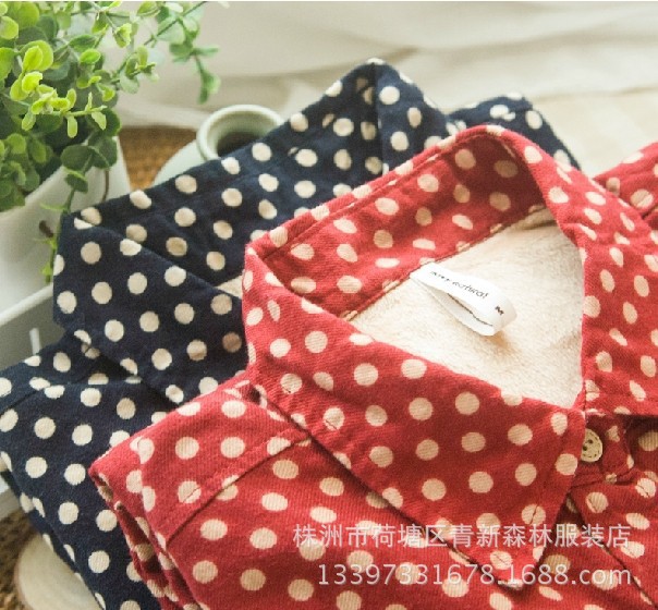 2014秋冬季新款女裝文藝日系波點加絨夾棉加厚長袖襯衫襯衣女 /