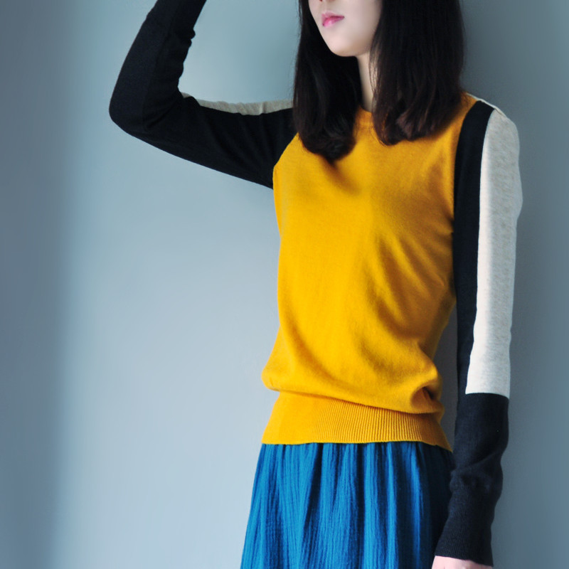 2015秋季女新款圓領(lǐng)拼接撞色韓版時尚顯瘦套頭毛衣打底衣羊毛衫 /