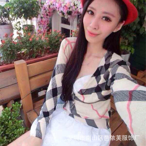 B家大碼修身短款V領長袖條紋格子印花針織開衫棉女毛衣外套批發(fā) /