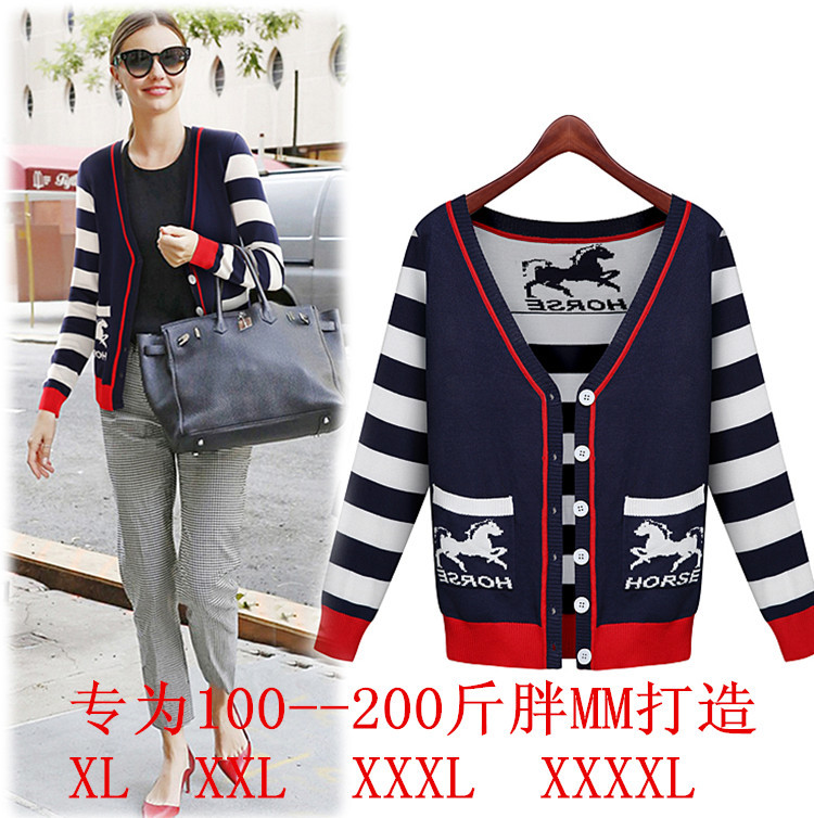 2015歐美大碼 胖MM秋季歐美條紋長袖針織開衫外套 /