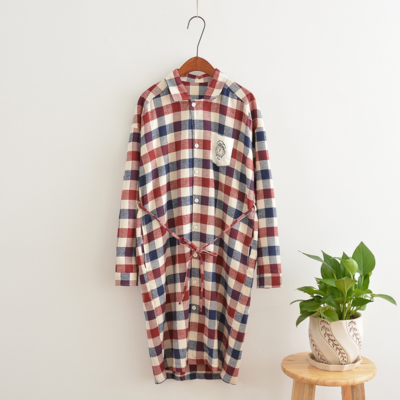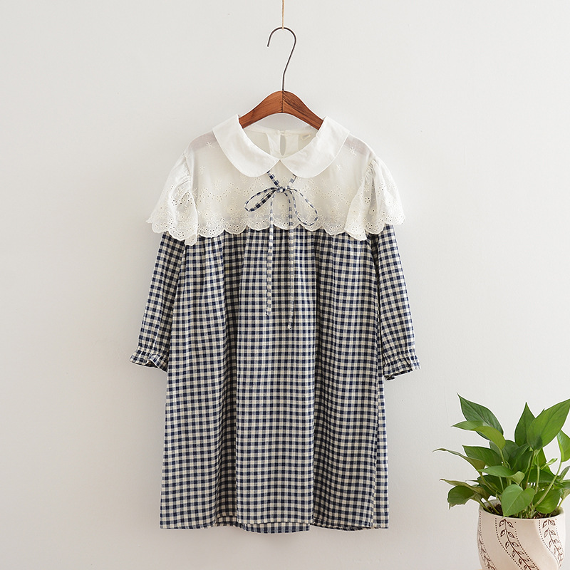 美爆了!新款秋季日系女裝 原創(chuàng)棉麻格子襯衫女刺繡品牌連衣裙 /