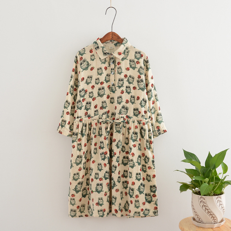 2015秋新款日系文藝襯衫貓頭鷹玫瑰花長(zhǎng)袖襯衣女裝連衣裙 /