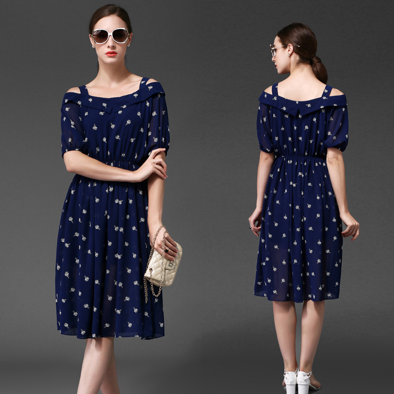 1612新款韓版大碼女裝夏裝胖mm寬松顯瘦一字領(lǐng)吊帶雪紡連衣裙女 /