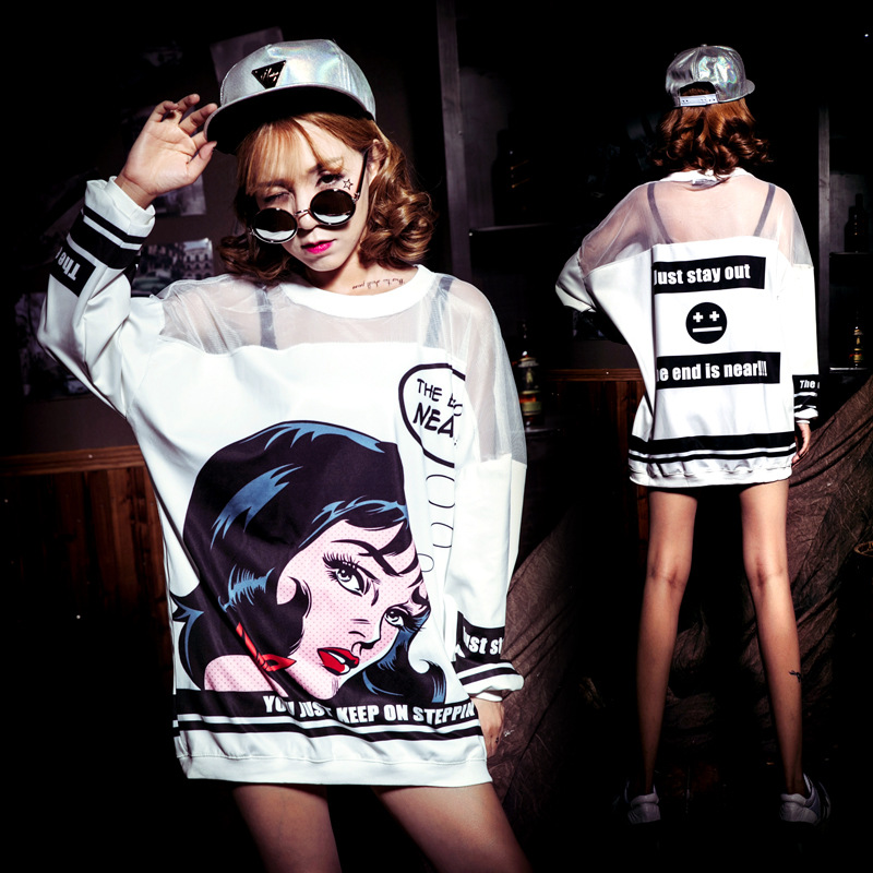 韓版長(zhǎng)袖紗網(wǎng)露肩字母印花中長(zhǎng)款上衣原宿寬松bf風(fēng)衛(wèi)衣女 /