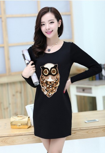 2015年春裝新款韓版女亮片貓頭鷹貼布修身長袖連衣裙 /