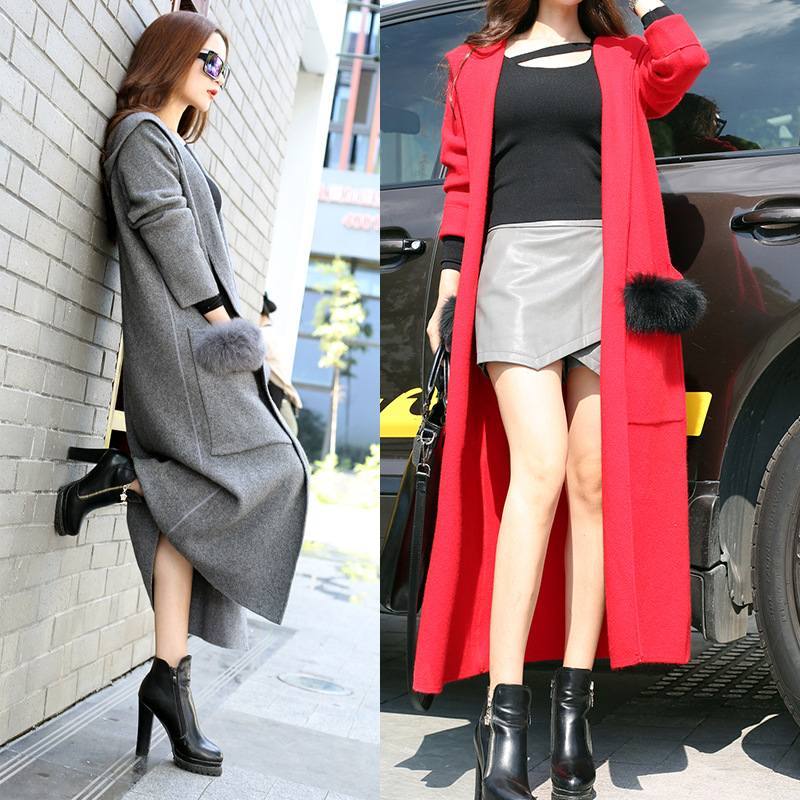 2015秋冬新款歐美大牌連帽大口袋狐貍毛毛貂絨針織開衫大衣外套女 /