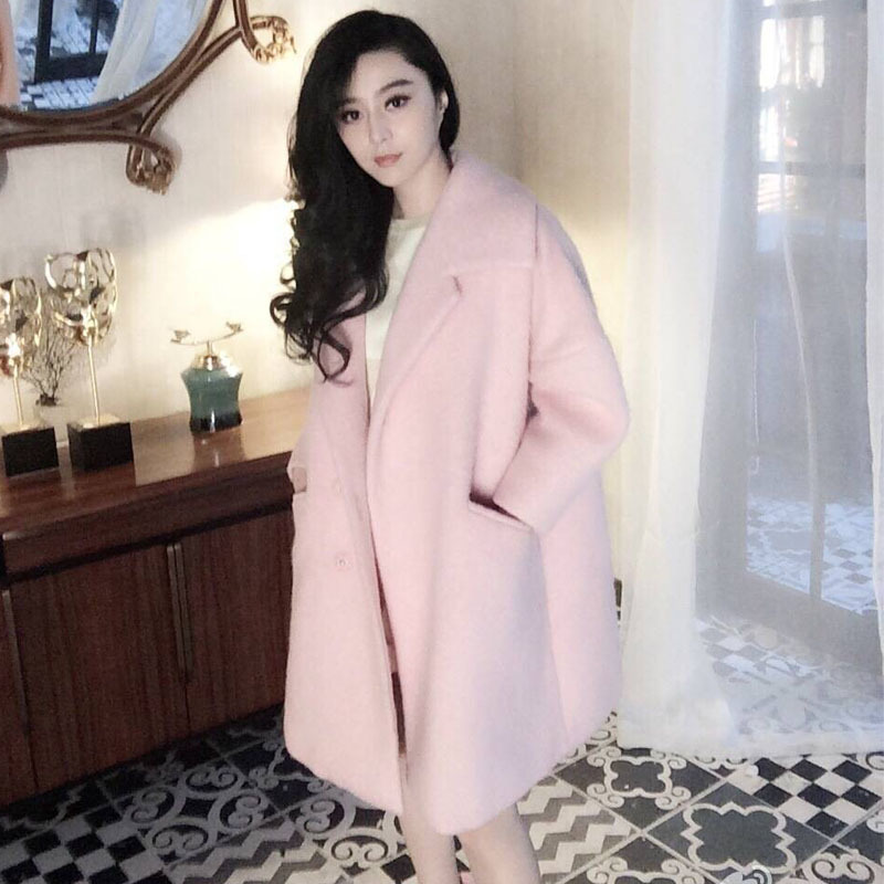 冬款范冰冰同款常微博廓形翻領(lǐng)加棉羊毛毛呢瑩粉色大衣#1003 /