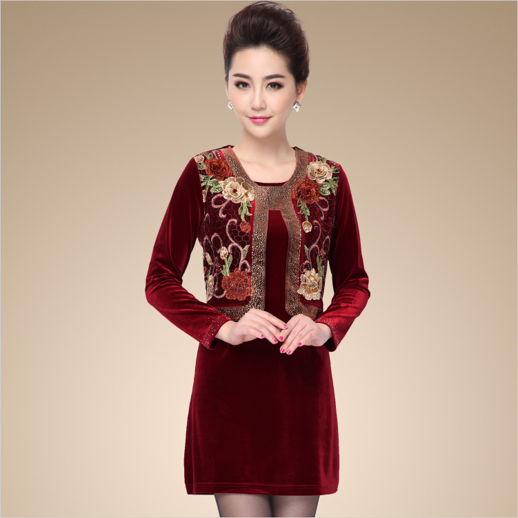 2015秋冬季新款女裝職業(yè)套裝中年兩件套氣質絲絨長袖媽媽裝連衣裙 /