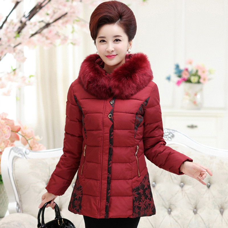 中老年女冬裝棉衣中年媽媽裝羽絨棉服印花外套加厚中長款毛領棉襖 /