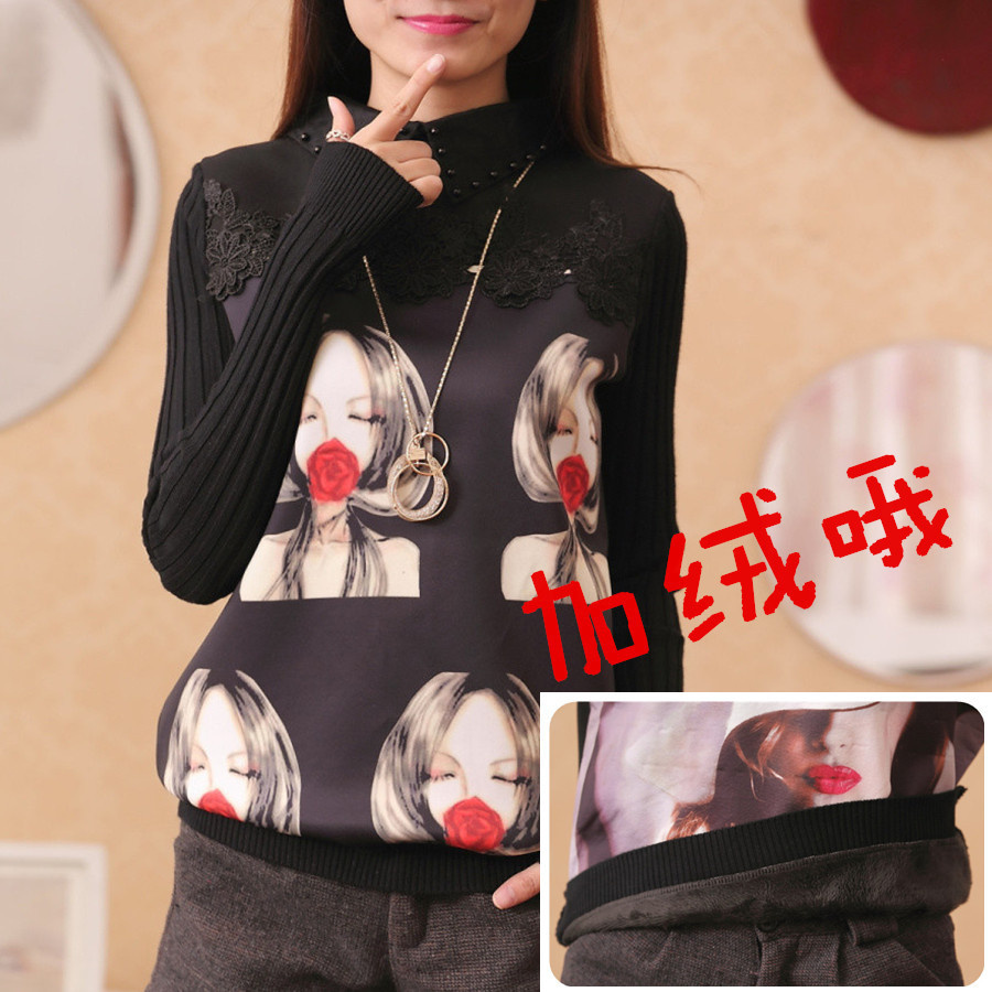 韓版2015新款冬裝女裝娃娃領(lǐng)印花加絨套頭打底毛衣假二件 /