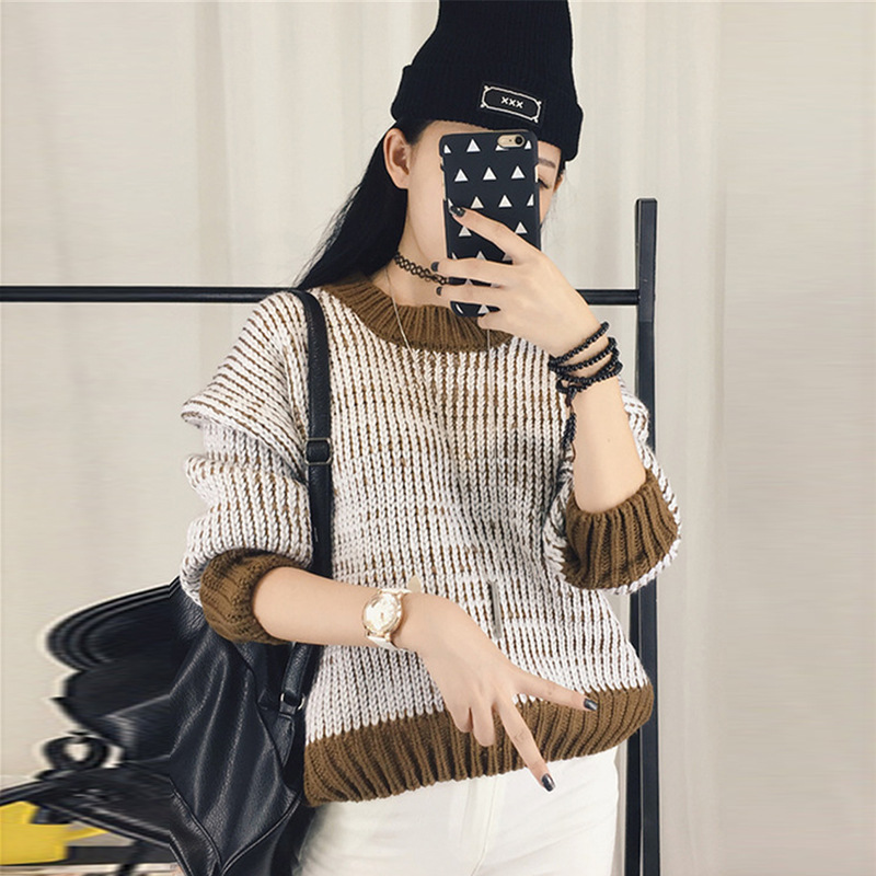 拼接撞色圓領(lǐng)長袖女式套頭針織衫 韓版寬松顯瘦潮流秋冬新款女裝 /