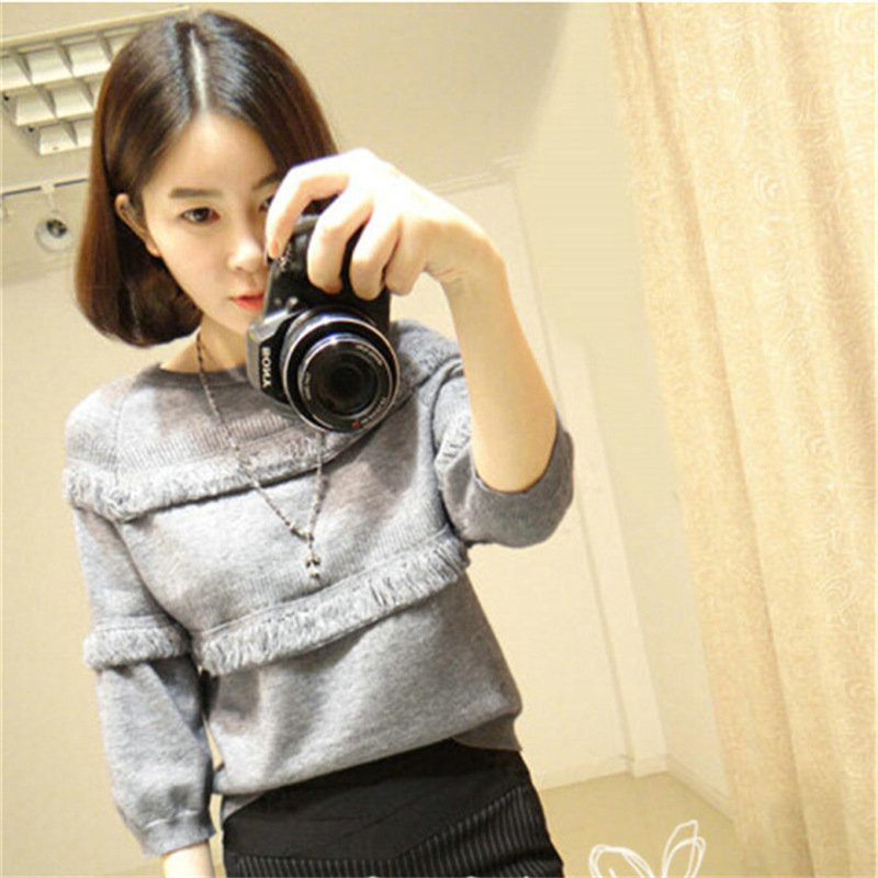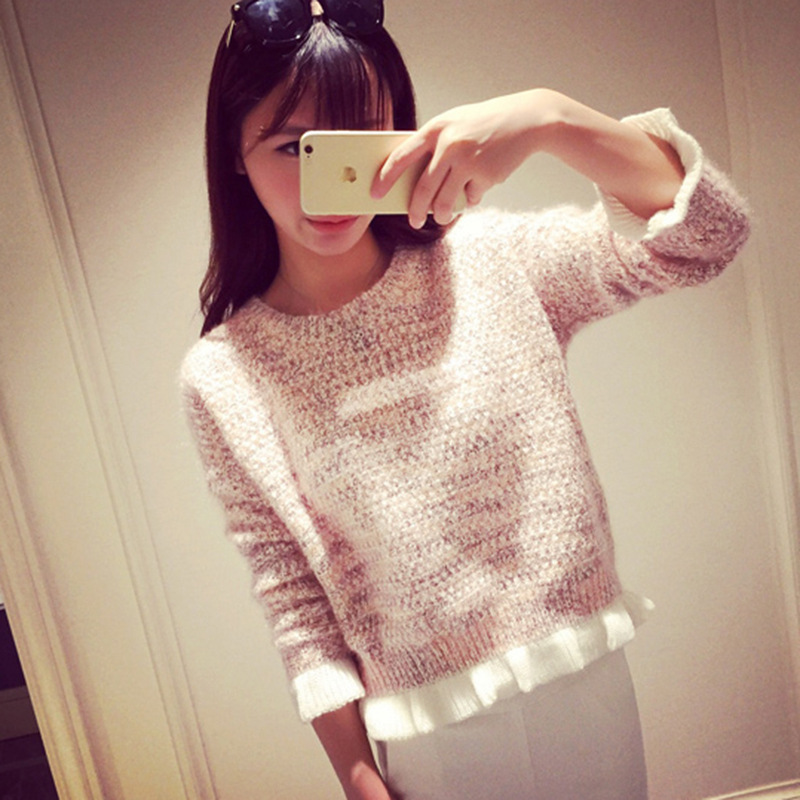 圓領(lǐng)七分袖短款下擺木耳邊女裝 2015秋冬新款女式套頭針織衫 批發(fā) /