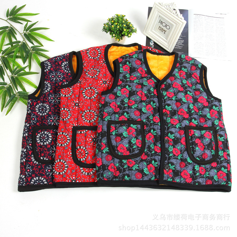 精美碎花印花開衫 時尚休閑中老年女士冬季保暖馬甲加絨加厚背心 /