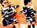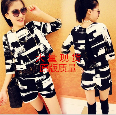 韓版抽象黑白印花后背開叉蕾絲拼接七分袖上衣+短褲套裝女 /