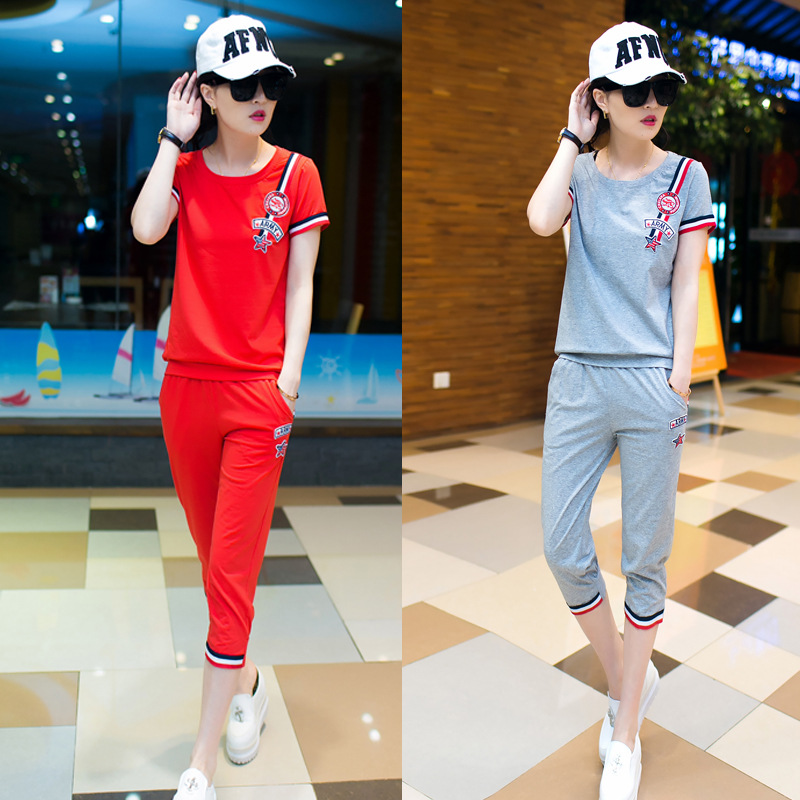 女休閑套裝運動服圓領(lǐng)短袖七分褲套裝大碼修身女士套裝潮 /