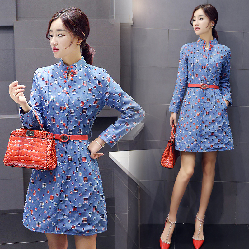 2015歐洲站秋裝新款長袖牛仔連衣裙女款大碼修身顯瘦韓版A字裙 /