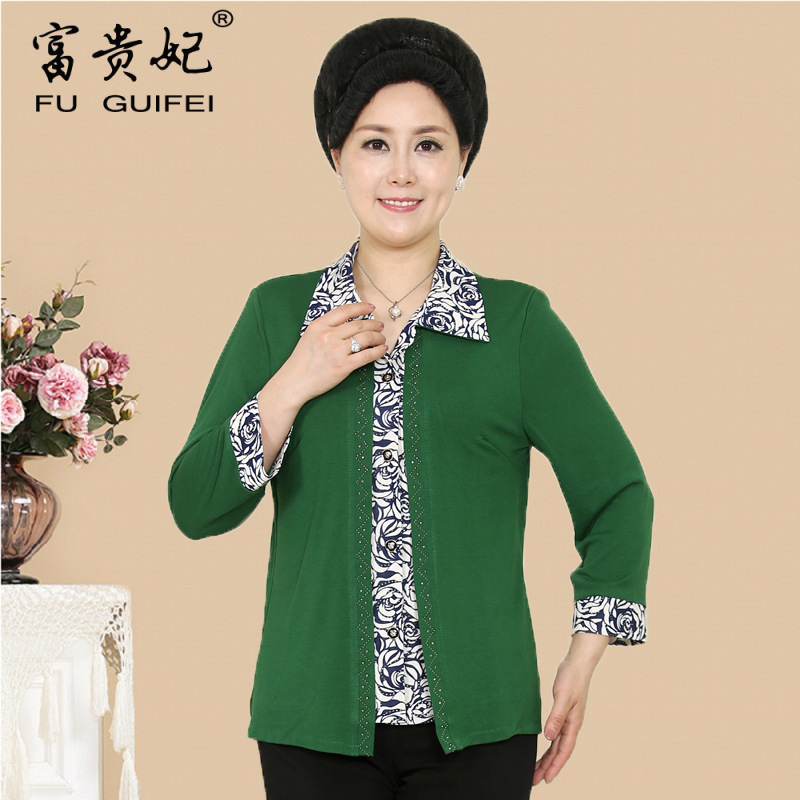 中年人媽媽裝時尚秋裝大碼長袖T恤假兩件套中老年女裝牡丹花上衣 /