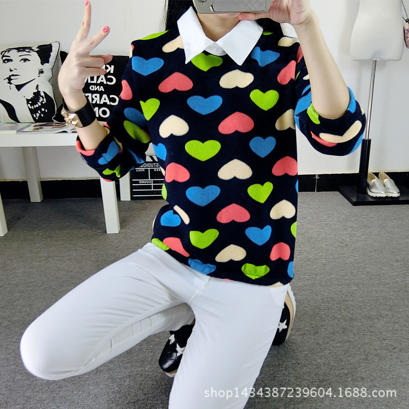2015冬裝加絨打底衫女長袖修身甜美小衫韓版針織打底花色雪紡衫潮 /