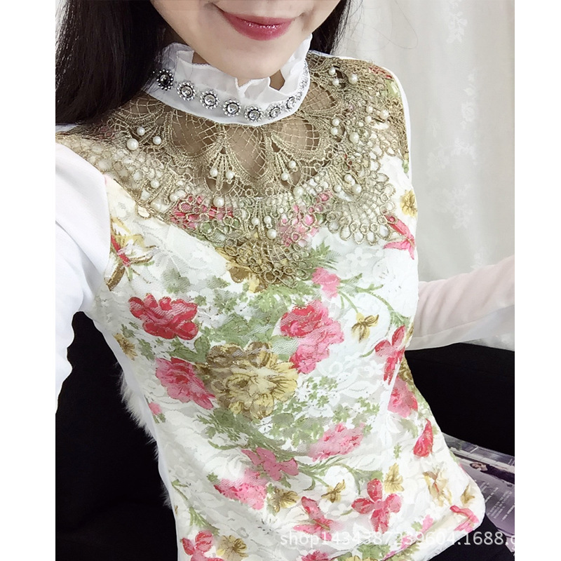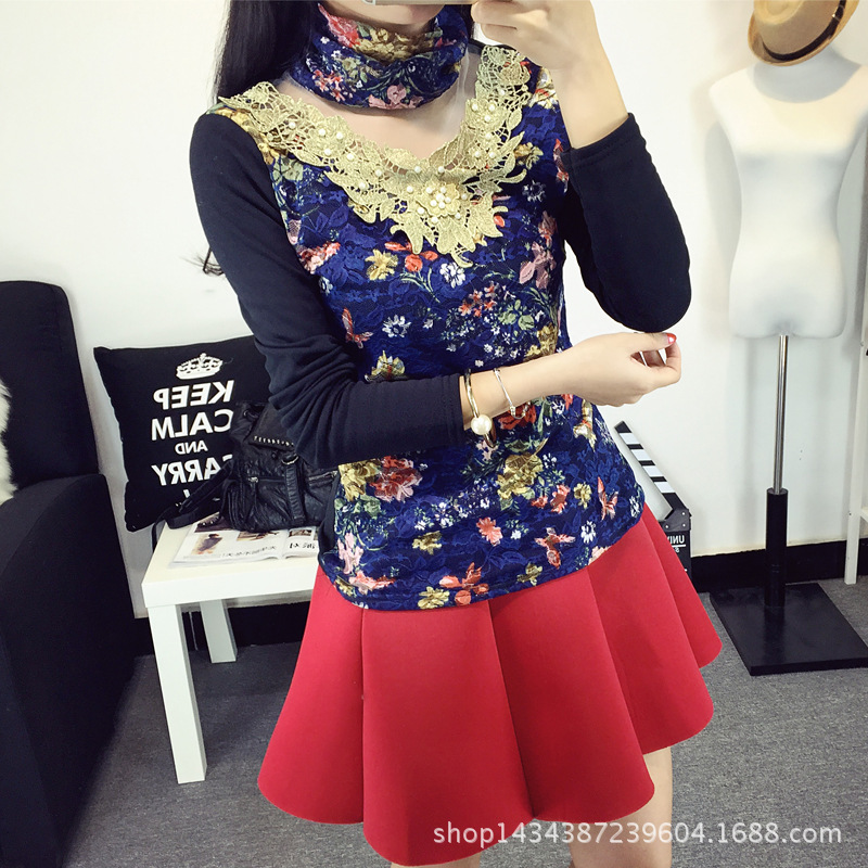 2015冬季新款保暖加絨打底衫女長袖修身花色蕾絲衫釘珠甜美小衫潮 /