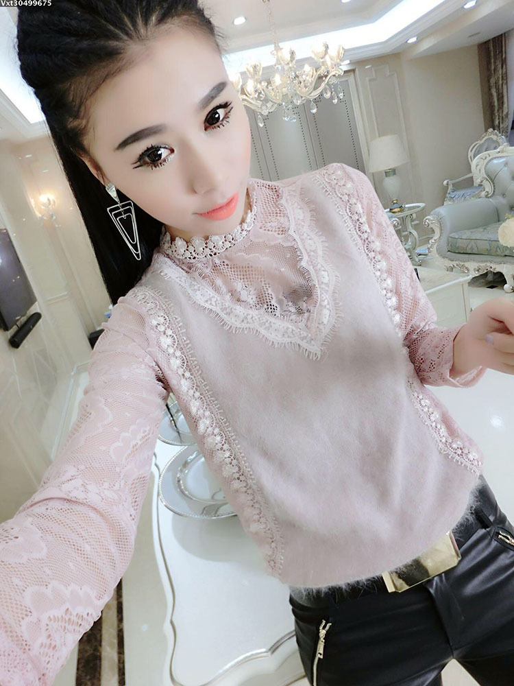 款歐洲站2015秋冬新氣質(zhì)款貂絨拼接蕾絲百搭打底上衣 /