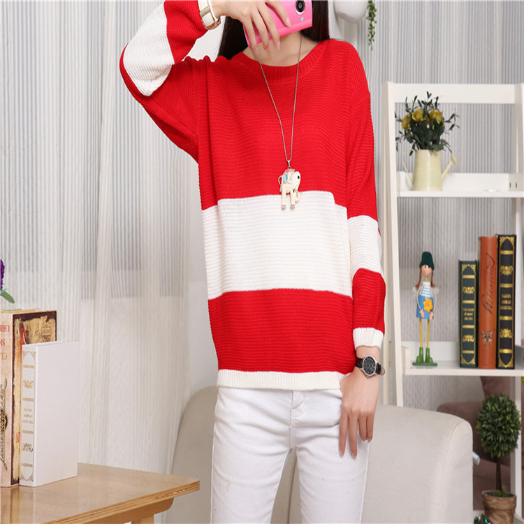 2015秋季新款女裝圓領(lǐng)寬松撞色韓版套頭毛針織衫 /