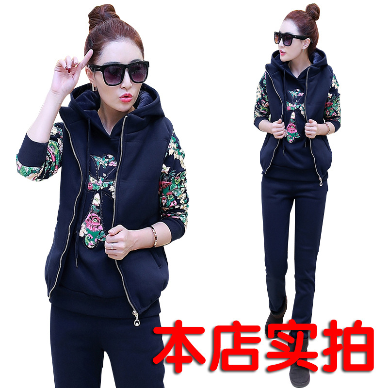 實(shí)拍時(shí)尚秋冬加厚衛(wèi)衣三件套韓版修身加絨大碼休閑運(yùn)動(dòng)套裝女 /