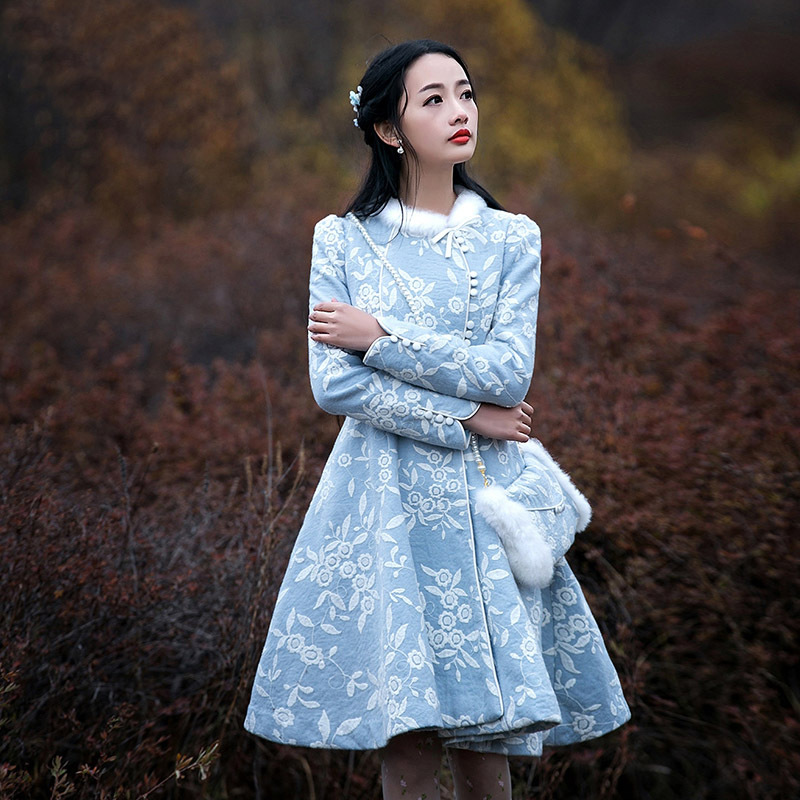 2015冬裝新款女裝 復(fù)古兔毛繡花小清新蕾絲毛呢外套 配包包女 /