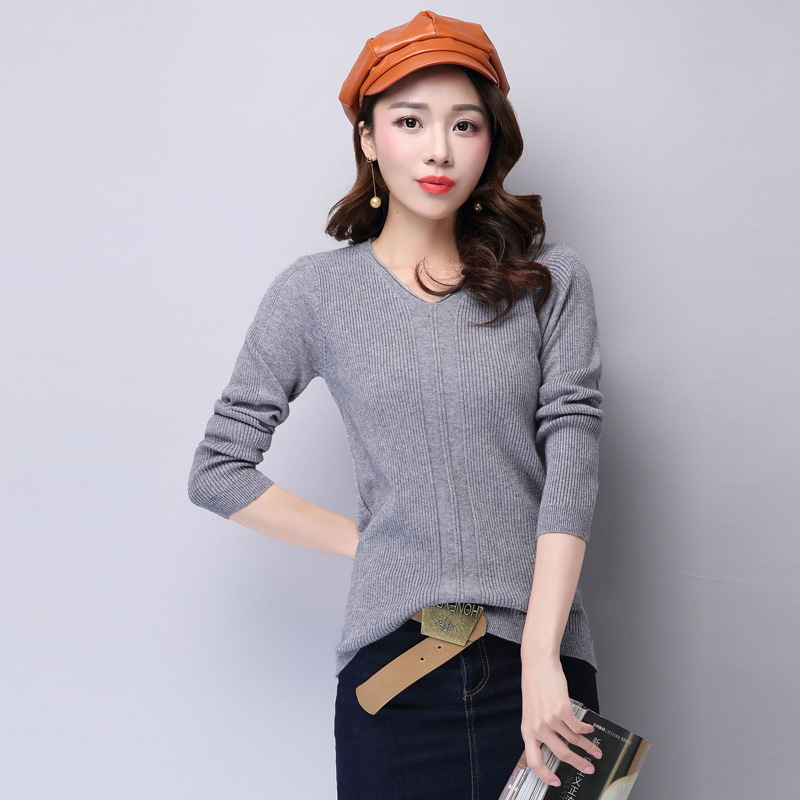 秋冬新款女士羊毛衫純色V領(lǐng)薄款打底套頭毛衣女款長袖修身針織衫 /