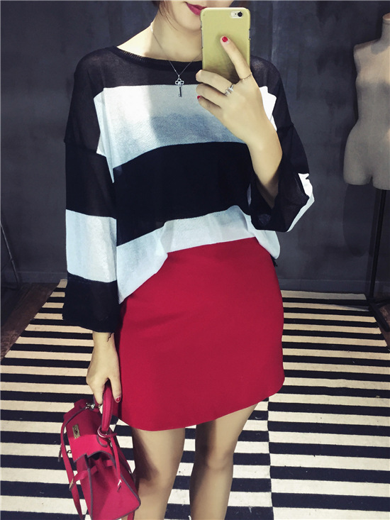 2015韓版毛衣秋新款時尚條紋針織衫長袖套頭針織衫女式打底衫 /