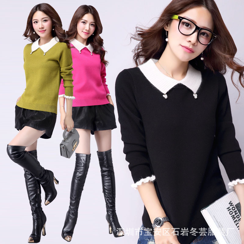 秋冬新款針織衫 女 韓版時尚娃娃領長袖套頭毛衣女 短款毛衣批發(fā) /