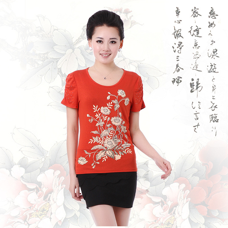 中老年女裝休閑通勤T恤大碼媽媽裝全棉超薄花案圓領(lǐng)短袖t恤 /