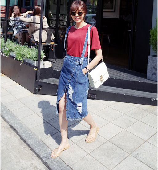 2015秋季新款韓版背帶可以拆卸視覺感很美的牛仔半身裙~ /