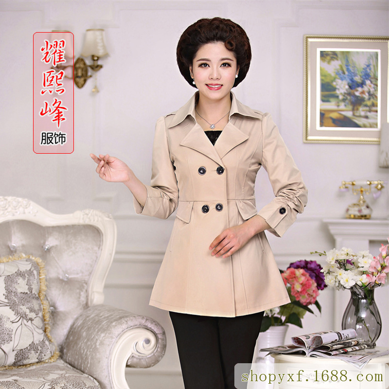 中老年女裝秋裝風衣外套新款中年媽媽裝雙排扣休閑修身翻領(lǐng)風衣 /