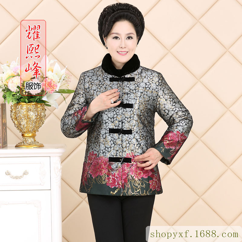 冬季新款中老年女裝棉衣高領(lǐng)圍脖大碼媽媽裝老年人亮金唐裝上衣 /