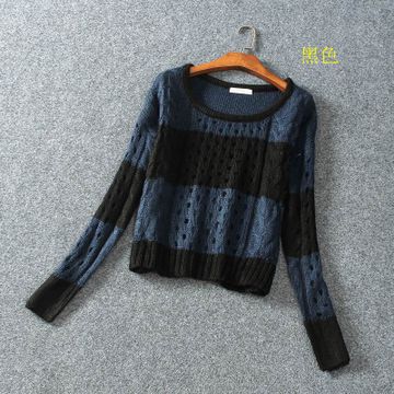 外貿(mào)原單2015秋季韓版女裝麻花鏤空圓領套頭橫條紋毛衣打底針織衫 /