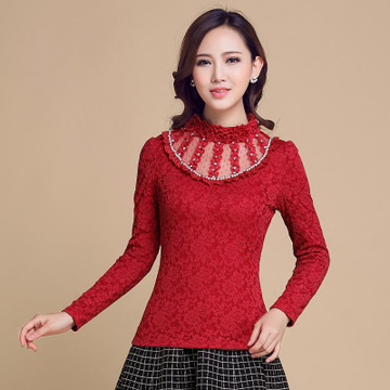 2015蕾絲加絨加厚打底衫韓版大碼女裝手工釘珠立領(lǐng)長袖保暖上衣 /