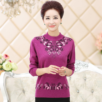 廠家新款 時尚百搭花案鑲鉆半高領長袖修身中老年女士套頭毛衣 /