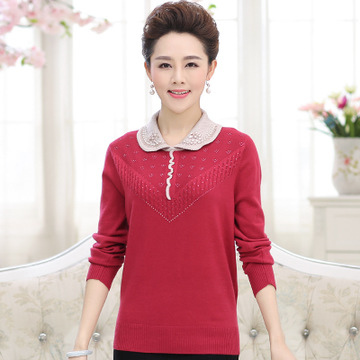 秋冬新款精致鑲鉆娃娃領純色百搭女士套頭針織衫 熱賣媽媽裝 /