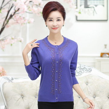 秋冬新款 純色百搭精美鑲鉆圓領長袖修身中老年女士毛衣開衫 /