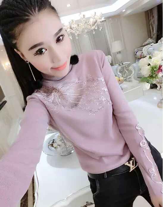 上衣加絨加厚高領(lǐng)打底衫女長袖蕾絲鏤空燙鉆修身女外穿打底衫 /