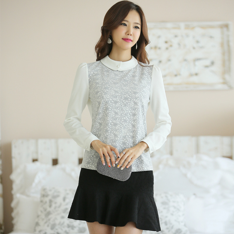秋裝新款韓國時(shí)尚純棉刺繡拼接襯衣蕾絲白領(lǐng)薄款打底衫女式襯衫女 /