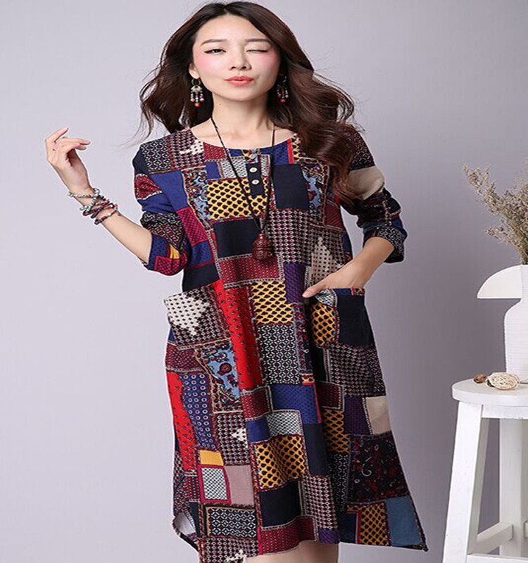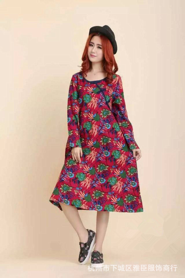 2015新款秋季大碼女裝文藝范棉麻印花寬松長袖不規(guī)則連衣裙 /