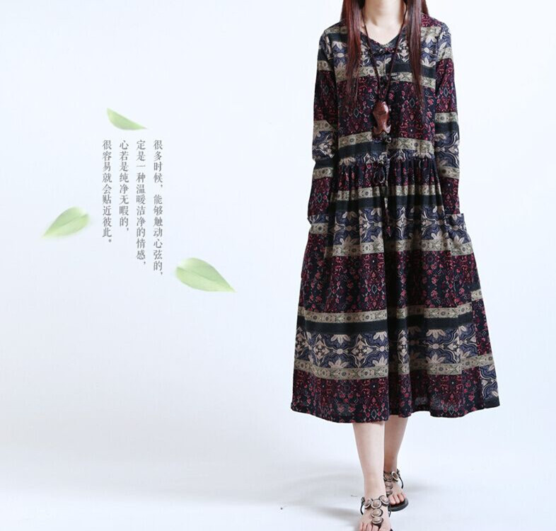 15新秋復(fù)古盤扣碎花棉麻長裙女 /