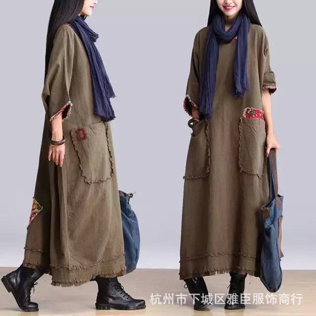 15新秋冬復(fù)古棉麻大版貼布流蘇女裝長袍子/高品質(zhì) /