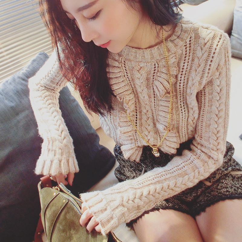 現(xiàn)貨 秋冬裝甜美荷葉花邊木耳邊圓領(lǐng)套頭長袖針織衫修身毛衣 /