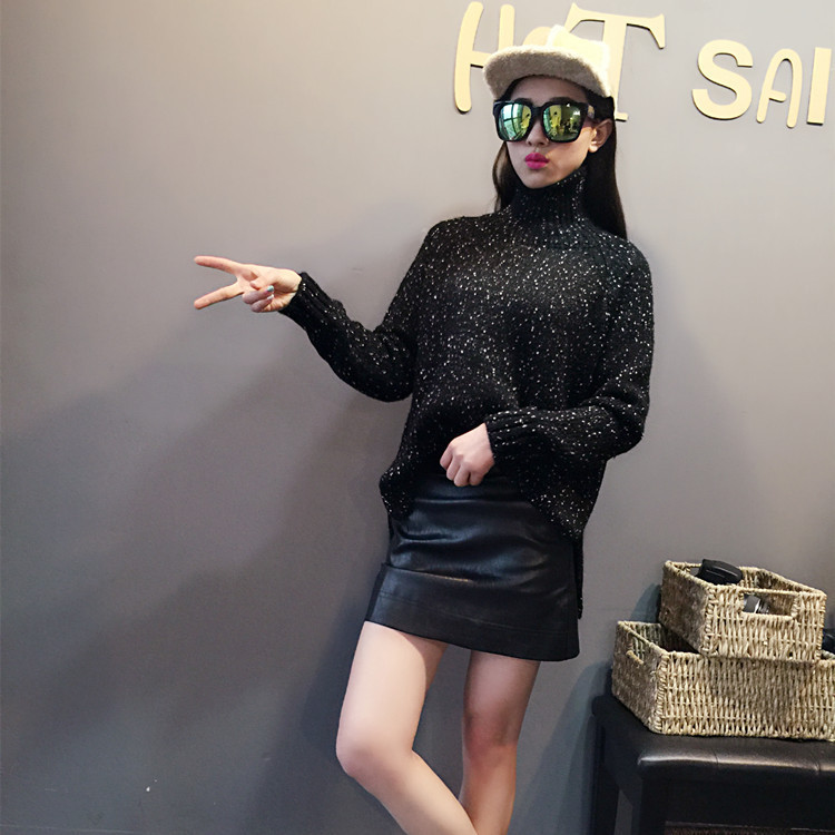 歐美大牌感 2015秋冬新款 高領(lǐng)粗針夾花紗下擺不規(guī)則開叉加厚毛衣 /